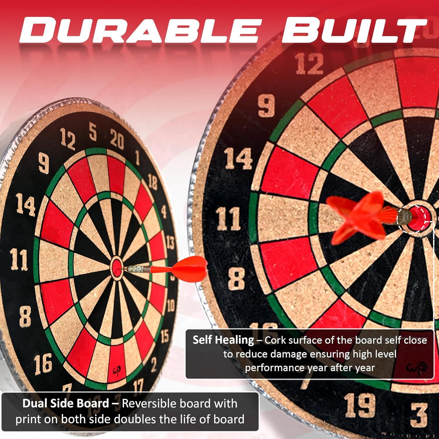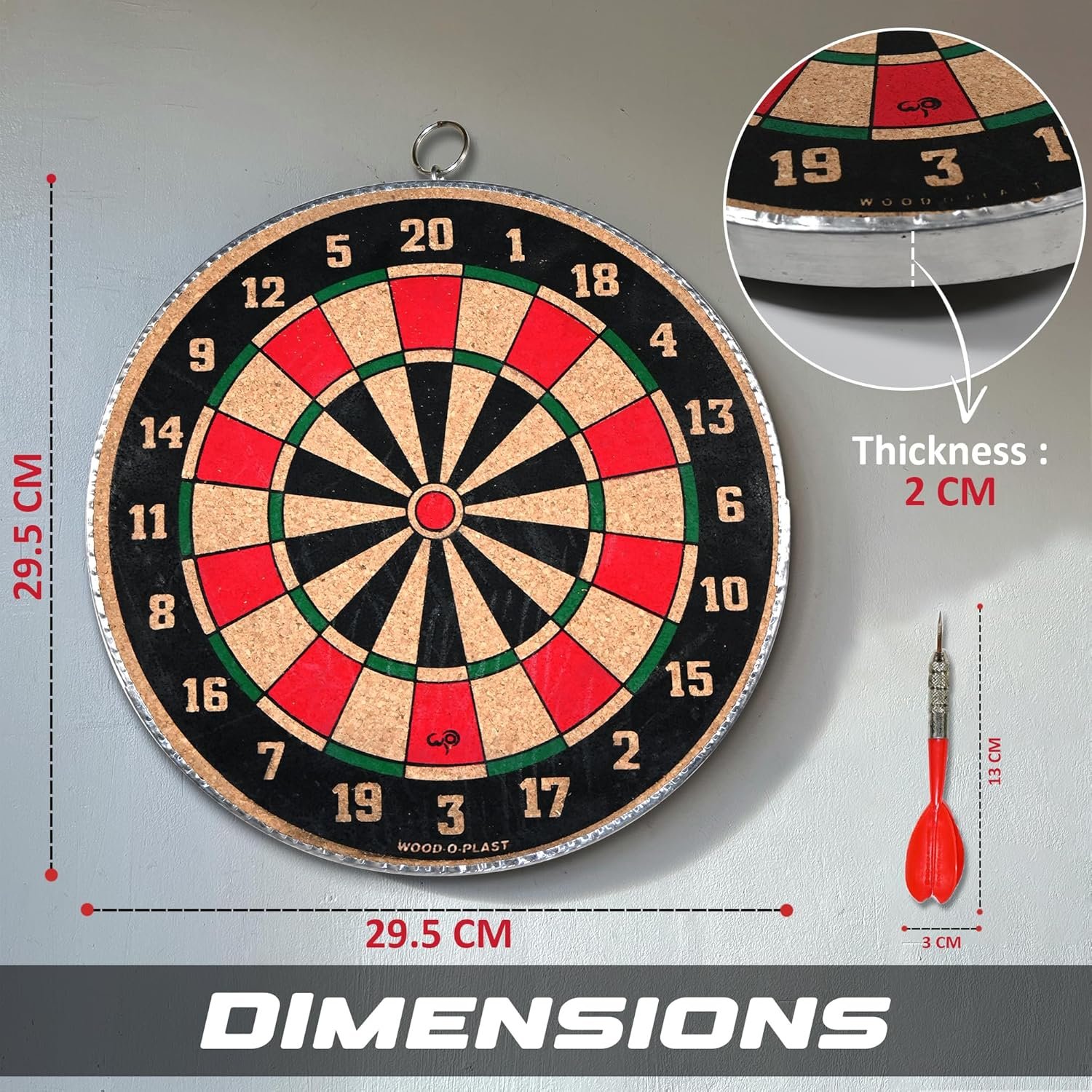 Wood O Plast Wooden Dart Board Game for Kids & Adults, Dual Sided Play, Steel-Tips Darts and 1 Hook for Hanging, Cork Surface, Indoor Outdoor Games for Kids, Dart Board Family Game Set (12 Inches) . Measuring 17.5 inches in diameter, this dart board is designed to meet official tournament regulations for a genuine dart-playing experience. This set comes complete with a set of steel tip darts, allowing you to start playing right out of the box, additional darts can be purchased separately.